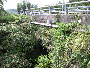 この橋は明治43年に架けられた、長さ6.5mの単一アーチの眼鏡橋です。橋は拡幅され、新しいカードレールがありますので、石橋とは気づきません。下に降りましたが足場が悪く、壁石には草が生えています。さらに周囲には雑木もあり、撮影しにくくなっています。苦労して撮影したのが、この写真です。