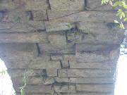 この写真は、眼鏡橋を真下から撮影したものです。架橋されてから150年経過しているためか、石組みにすきまが生じたり、石にひびが見えます。いづれ補強しなければならないでしょう。当時としては最先端の技術だったかもしれませんが、接着剤はなかったのかもしれません。