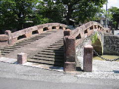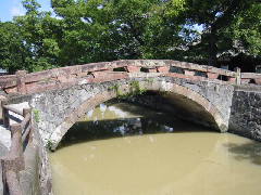 場所 船場橋(せんばばし)の所在地は、宇土市の商店街を流れる船場川に架かっています。新町通りから30mほど路地に入った所です。この周辺一帯を船場といい、城下町として発達していたとき、舟の荷揚げ場だった所です。有名な橋ですから、商店街で訪ねれば教えてくれるはずです。