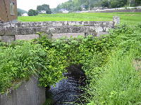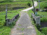 この石橋は、水田のための用水路に架けられた小さな橋です。単一アーチの石橋で、橋の長さ6.9m、橋の幅1.9m、スパン2.8mの造りで、橋の上は簡易舗装がしてあります。小さな橋の割には欄干と手すりだけが立派な造りになっています。橋の両側は草が生い茂り、アーチも見えない状態でした。せめて観光案内のパンフレットにのせるなら、草取りはして欲しいのですが。