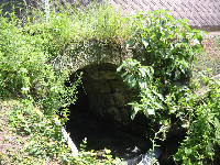 この新村眼鏡橋は、津奈木町指定文化財です。なぜこんな所にと思うような小さな石橋です。浜眼鏡橋と同じように、丸太を渡しても橋ができる川幅です。橋の長さは1.7m、橋の幅は1.5mあります。この石橋を渡ると、住宅が一軒だけあります。それ以上は山になりますから、この家のために造られたものかもしれません。