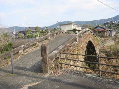 この橋は、嘉永元年(1848年)に架けられました。橋の長さ22.7m、橋の幅3.7mの単一アーチの眼鏡橋です。豊野町指定の文化財として保存されています。歩くことはできますが、車止めのクイが立てられています。下を流れる川は、浜戸川になります。親柱と欄干は当時のままで、当時の面影を残しています。