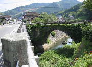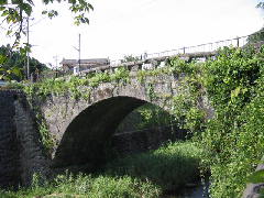 この橋は明治14年、国道建設のときに弁天高井川間の男岳川に架けられた石橋です。現在は町道となっていますが、車も通れるようです。橋の長さ19.75m、橋の幅5mの単一アーチ橋です。老人クラブ連合会の説明書きによりますと、石工は皇居の二重橋・日本橋をかけた名工、橋本丈八(勘五郎)であるという、と記されています。昭和49年11月17日に、鹿北町文化財に指定されています。