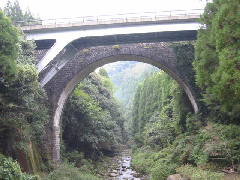 単一アーチのとても大きな石橋です。大きく見える理由は、その高さから感じる印象が強いからでしょう。大正13年(1924)に建てられた新しい橋ですが、お隣に鉄骨の橋ができたために使用されなくなりました。一番上の写真でわかるように、車止めのクイがあります。長さ60m、幅5.8m、高さ24mの規模です。この写真は二俣橋から撮影したもので、右手に公園があります。