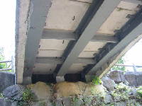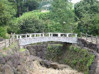 この橋は、本当の石橋ではありません。遠くから見ると輪石もあり石橋にそっくりなのですが、橋の内部は鉄骨で支えられています。上の写真のようなアーチでは、実際の石橋は造れないでしょう。公園の情景に一致するように設計されたものだと思います。輪石は3cm程度の石が、鉄骨に貼り付けられてあります。現代の技術で石橋を造れば、このようになるということを紹介しました。