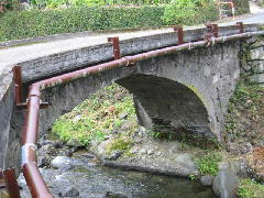 この石橋は明治10年(1877年)に、種山組によって架けられた単一アーチの石橋です。橋の長さ13.3m、幅2.23m、径間9.1m、拱矢3mとなっています。この石橋は現在も使用されていますが、橋の上はコンクリートで拡張されています。橋は村の生命線ですが、車に合わせて広げられたようです。橋の下で小学生の男子が、水着で遊んでいました。昔も昔も、橋の下は子どもたちの遊び場になっています。学校のプールでは味わえない良さが、きれいな小川にあるのでしょう。