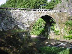 この橋は安政2年(1855)に架けられた、単一のアーチ橋です。橋の長さは62mにもなり、熊本県でも長い石橋ということになります。幅員(道幅)は4mとなっています。この橋を造った石工は、種山の甚兵と卯助兄弟です。この橋は昭和59年3月3日付けで、熊本県指定重要文化財になっています。静かな山村の中で、周辺は公園化されています。この石橋を延長した形で八勢小橋があり、その横に八勢水路橋があります。現在は車の乗り入れはできませんが、歩いて渡れば江戸時代の雰囲気にひたることができます。