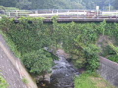 ご覧の通り、この橋の壁石一面にカズラの葉がおおい、アーチの部分は見えません。明治36年(1903)に架けられた、単一のアーチ橋です。橋の長さは29mと長いのですが、菊池市の文化財でもないため案内板もありません。写真は上流側の土手から撮影しました。かなりの高さがあり、ころばぬよう注意して歩きました。下流側から撮影しても、新しい橋のために見えないでしょう。