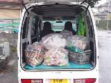 しかし、この埋立てごみ袋の中にスプレー缶やビンカン、乾電池等の分別がされていなかったため、何枚も違反シールが貼られていました。袋を開封して、分別作業をしなければなりません。写真は車のごみ回収の様子と、公民館での分別作業です。ごみSTを気持ちよく使ってほしいという願いから、違反ごみ回収を行っています。 |