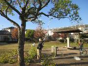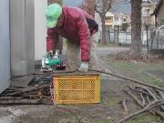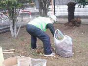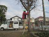 | 下代公園の整備が進んでいます。剪定作業です 辻さんが公園の整備に汗を流しています。ごみ拾いはもちろんのこと、フェンス沿いの樹木の剪定をしています。年末には、大きな樹木(クス)の剪定を2人で相談しながら実施しました。私はタイワンフウの細かな枝の剪定と、大きな剪定枝を丸ノコで処理しています。 |