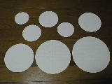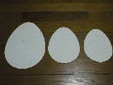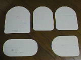 左の写真は、タオル掛け・ペンシルケース・リース・小物入れ等を作るときの型です。右の写真は、キッチンペーパーホルダーの台です。少し大き目ですが、板の無駄はなくなります。型紙には、心棒の位置とトールの位置を決めるため、穴をあけています。型を写すときいっしょに千枚通しで印を入れておきます。 | ![]() |