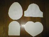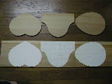 例えば左のような型を板の上に乗せて、鉛筆でなぞります。そして糸のこで線のとおりに切れば無駄もありません。右は型と切った板です。ハートと楕円は壁掛けに、もう一つは時計の置物になります。どんな絵を利用するかは、作るときに考えます。 | ![]() |