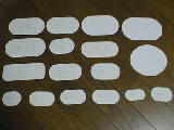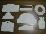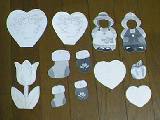 これらの型は、小さい物です。ハートや人形も10cm程度の大きさです。裏にマグネットを付けることもあります。右は小物の台になります。板を切ったあとに余りが出ます。捨てるのももったいないので、板のサイズに合わせて線を引き、切っています。 | ![]() |