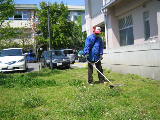 学校の草刈りは、エンジン草刈り機でします。19日は会議も出張もなかったので、お昼から始めました。一番草が伸びているのは、私の作業場の中庭です。1時半から開始して、3時間の草刈りでした。東側の草は、一応終了しました。3時間も草刈り機を握っていると、手がしびれてきます。4月27日(金)も草刈りして、中庭の中央部分を済ませました。9時半に開始して、終ったのは午後3時過ぎでした。早くしなければ、花の移植作業の場所がなかったからです。