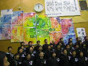 三年生に感謝の気持ちを表すため、式辞の中に「皆さんの日々の学業生活に中学生本来の姿を見ることができ、私自身も皆さんに出会ってよかったと思っています。」 という一文を挿入しました。写真のパネルは美術の卒業制作の作品で、「響き」というテーマです。校舎の壁面に掲示されます。 |