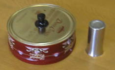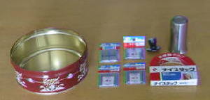 材料 @クッキーの空き缶 A板鉛数個(幅1.5cm、長さ30cm、厚さ0.4mm)〜釣具店 Bなべ用のつまみ〜百円ショップ C幅1.5cmの両面テープ D押しピン1個 六こまをまわすコップ〜底の部分がくぼんでいる物