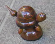 高さ10cmほどの、かわいいカメの形をしています。こまに興味がない方は、この形を見てもただの置物としか思わないでしょう。かなり精巧な作りで、九つのパーツで構成されています。そして、それらはすべてがこまなのです。大中小と分けると、大は甲羅、胴、台の三個です。中は頭と尾になります。そして、足の四個が小になります。合計9個。動物をかたどったこまは他にもありますが、これほどたくさんのパーツで作られたこまは少ないと思っています。しかも仕上がりもきれいです。