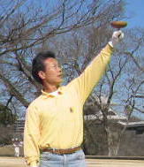 上の写真では、こまは水平です。そして、こまの芯は左手の握りこぶしの、人差し指と中指のくぼみで回転しています。大振りから入り、こまを一旦掌で受けます。そして、少し上にあげて、握りこぶしの上にあげます。この方の場合はこまが水平ですから、身体を左回りにする必要はありません。自由の女神の変形といったところでしょうか。この方は、掌・足・腕といろんな場所で回すのが得意です。