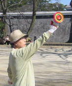 こちらが正しい「自由の女神」です。さて、こまは右手の人差し指と中指の二本で受けています。こちらも大振りから入ります。大振りから引き上げ、一旦右手の人差し指の上に乗せます。その後こまを滑らせ、二本の指の間に固定します。そして、腕を高くあげます。上手になれば、こまを引き寄せるとき、ひもでなくて直接二本の指で受けるそうです。しかし、こまは高速回転しているから、手前に走る場合多いとのことです。練習を重ねないと、こまが二本の指に止まらないでしょう。こまが垂直ですから、身体をすこしずつ左回りにしなければなりません。