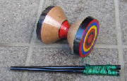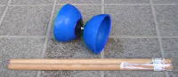 ディアボロ こちらは、アメリカで発達したようです。ホームページで購入して確認したら、オーストラリア製でした。おわんの形をしたゴム製の輪が、プラスチックと金属で固定されています。輪の直径は10cm、横幅は11cmです。輪鼓こまよりも一回り大きく、操作する棒も40cmあります。このこまの良さは、地面に落としても割れませんから、練習する場所を選びません。どんな技があるかは、ホームページで検索したほうがいいでしょう。動画でも見ることができます。ディアボロ二個を扱った高度な技に驚きます。