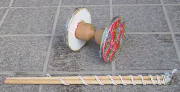 中国の輪鼓こま 写真のこまは、15年程前に自作したものです。本当に作りたかったのは、中国のこまです。輪鼓こまは、中国から長崎へ伝わったのではないでしょうか。長崎のこまよりももっと大きく、がっしりした感じが本物です。写真で見たことがありますが、中国の雑技団が実演していました。所持している本に作り方が載っていましたので、円柱形の木材を削りました。輪の部分は厚紙で、中に鉛を入れています。中学生にやって見せましたが、その都度壊れました。