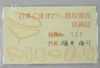 平成15年9月のある日のことです。こまのホームページを検索していたら、こまの普及を目的とする組織があることを知りました。それは、「日本こままわし普及協会」です。会長さんにメールで入会を申込み、正規の手続きをいたしました。入金も済ませ、しばらくして会員証が届きました。私は、平成15年9月30日の入会です。会員bP37です。写真は会員証です。それでは、全国で積極的に活動をしている「日本こままわし普及協会」を紹介します。(平成16年3月作成)