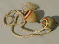 このこまを知ったのは「伝承おもちゃをつくる」大月書店の図書を購入したためです。詳しい作り方と遊び方が載っています。曲芸ごまですが、買えば何万円もします。博多ごまに似ていますが、芯棒にV字型のみぞを水平にいれます。このみぞにテグスを一回巻いてこまを乗せることになります。いつか、こまの作り方のページを掲載します。