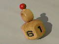 数学の確率の実験でもできそうなこまです。数字はサイコロと同じで1から6まで記してあります。回し方は、ひも引きこまになります。木製で、掌サイズに作られています。横に倒れて、一つの面が上になります。