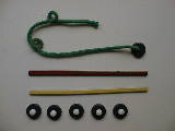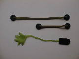 左は一番のお気に入り「伸びる手ゴムひも」です。これは実によく伸びます。スーパーや玩具店で「伸びる手」あるいは「カメレオンの舌」という名で販売されています。定価は百円から三百円程度です。2m位伸びても張力が弱いので、マグネットを弾き飛ばすことはありません。利用価値が高い教具になります。三年生の「円の学習」二年生の「平行四辺形」「等積変形」で威力を発揮します。私はいつも授業のときには、このひもを持ち歩いていました。穴あきのマグネットも市販されていますので、両端に二個取り付けています。