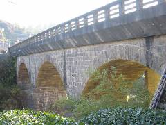 この眼鏡橋は、大正6年(1917)5月に完成しています。ご覧のように新しい橋で、三連式のアーチになっています。近代的な雰囲気を漂わせ、輪石と壁石は整然と並んでいます。八女郡北川内村の萩本卯作によって架橋されました。橋の長さ45.5mと長いのですが、復員は3.7mと狭くなっています。径間12.0mです。