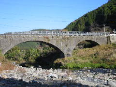 | 栗林眼鏡橋 この栗林橋は、国庫補助11370円、村費479円、並びに117名の一般寄付1084円によって、栗林東ノ下から栗林間の星野川に、昭和4年石造り眼鏡橋が山下佐太郎によって架設された。それ以前は、大正7年(1918)3月、村費によって石造り一連式アーチ型の石橋が架設されていたが、惜しくも大正11年の大洪水で流失した。 その後、木橋が架設されたが、又も昭和3年(1928)洪水によって流失したため、現在の石橋が架設され、美しい弧を描き、区民の便益と繁栄を保っている。 平成9年3月 上陽町教育委員会 |