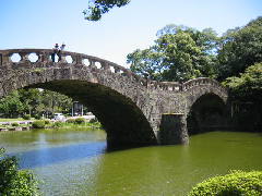 橋の長さ49.25m、幅5.5mの眼鏡橋は、天保10年(1839)に完成しました。諫早市内を流れる本明川に架けられていましたが、河川改修に伴って公園に保存されました。昭和33年(1958年)に国の重要文化財に指定されましたが、その三年後(昭和36年・1961年)に移設保存されたものです。