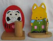 次の左2つは、ペンホルダーです。背面にメモホルダーになるよう、クリップを接着しています。右の2つもペンホルダーです。ダルマの作品に、百円ショップの木材を取り付けました。キツネの絵はお気に入りの一つで、いくつも作ります。