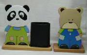 次の左2つは、同じくペンホルダーです。服の色に悩みますが、同系色が無難かなとも思っています。白のシャツはどれにも合いますね。パンダは新作です。黒い品物は、百円ショップで購入したメガネケースです。鉛筆立てにしました。