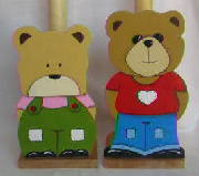 右の二つはどちらもクマです。緑の服を着たクマのほうが可愛く感じます。赤シャツのクマはメタボになりました。お腹が出ていて、私の姿に似ています。この服の形は、男の子に似合います。