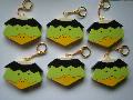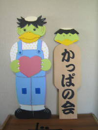 かっぱの姿と、看板です。「かっぱの会」というのは、ボランティアの会ということでした。右の写真は、サービスでプレゼントしたかっぱのキーホルダーです。こちらは厚さ1cmの版木を利用しました。