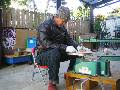 何とか形が決まり、アガチス材に転写して、糸のこで切りました。1時間以上かけて、駐車場で作業したのです。長さは60cm程度です。サービスで看板も作ることにしました。