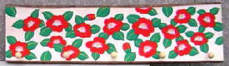人吉地方に伝わるつばきの絵をモデルにしました。板のサイズは縦22cm、横92cmの大きなものです。板の代金は、1600円もかかりました。球(木)を五個とりつけましたが、学校で作業用の帽子かけにしています。平成15年7月21日に完成です。今後はこの板を利用して、オリジナルの花の絵を描きたいと計画しています。朝顔・菊・パンジー・スイセン・・・・・・・・。