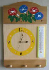 できるだけ実用的な作品にしておけば、プレゼントした方も喜びます。今回工夫したことは、100円ショップの寒暖計を貼り付けたことです。このような時計はめったにありませんが、より実用的になったと満足しています。