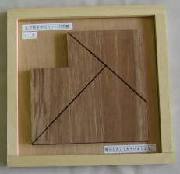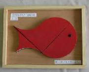 最も簡単な教具になります。3個の木片を並べかえるだけのことですが、曲線で構成されたものが正方形になる面白さがあります。金魚の目は、釘を利用しました。布を押さえるタイプの釘で、ホームセンターにあります。