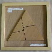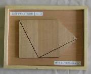 最初の図は、同型の直角三角形五枚になっていました。問題は一枚だけハサミで切るように指示してありましたが、木製のために切断した形で提示しました。この方法は、三平方の定理証明に利用できます。