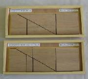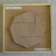 今回は、並べかえて正方形を作る教具です。パズルの本を参考に、10種類の形を作成しました。いづれも人気があり、子どもから大人まで熱中していました。材料は、15mm厚のラワン板です。糸鋸で切断し、ベルトサンダーでみがき、最後はサンドペーパーで仕上げました。幼い子どもがけがをしないように、それなりに気をつかったつもりです。ケースのサイズは大半は縦横30cmにしました。重ねたとき傷が付かないように、木枠が教具よりも高くなっています。