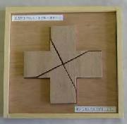 五角形を二本の直線で分割したものです。五角形の構成は、正方形と底辺を同じ長さとした直角二等辺三角形です。切断した二本の直線は、直角で交わっています。小さな木片二枚を上に移動させることで、正方形とすることができます。