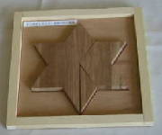 参考図書によると、イギリスのパズル研究家デュードニーの作品ということです。これを中村義作氏が、はとめ返しの作品にしました。はとめ返しは紙で作ることになりますが、私はそのまま木製にしました。4個の木片を移動させ、正方形にします。