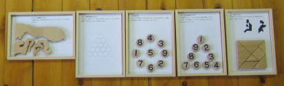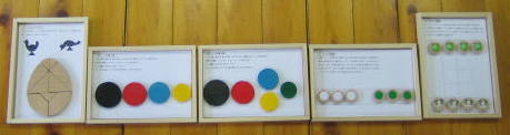 平成19年8月から作成した、新しい教材を紹介します。数が多いので、30個ずつの紹介となりました。箱のサイズはすべてB5となっています。横18cm縦26cm程度の大きさで、前回の教材よりも小さくしました。教材の形にあわせ、横置きとしたものもあります。写真は5個ずつ撮影し、その下に簡単な説明をつけました。