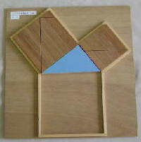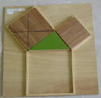 このページは、三平方の定理証明に関するパズルです。教材として三種類を用意しましたが、この方法は他にもあります。要するに、二つの正方形を組み合わせて、一つの正方形にすればいいわけです。しかし、小中学生が対象ですから、個数が多くなる切断は無理です。15mm厚のラワン板を利用しました。台になっているベニヤ板は、座布団くらいの大きさです。