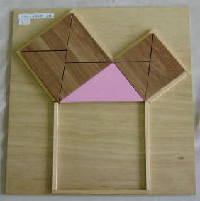 三種類の中では、最も分かりにくくなっています。その理由は、木片が8個になるからです。切断の方法は簡単ですが、並べるのは困難です。ヒントになるのは、木片の中に合同な三角形が四組あることでしょう。