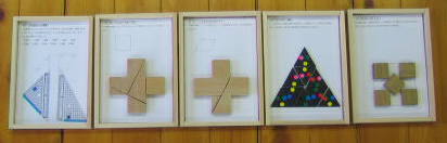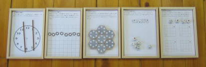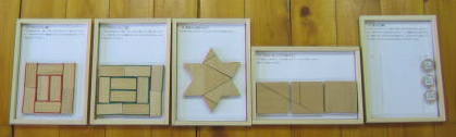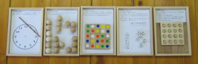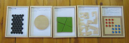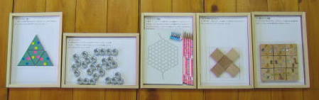 平成19年8月から作成した、新しい教材を紹介します。数が多いので、30個ずつの紹介となりました。箱のサイズはすべてB5となっています。横18cm縦26cm程度の大きさで、前回の教材よりも小さくしました。教材の形にあわせ、横置きとしたものもあります。写真は5個ずつ撮影し、その下に簡単な説明をつけました。