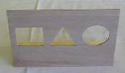 この三つのくりぬいた穴に、ちょうどすっぽり入るコルク栓を考える問題です。解答の木材は、自分で切断しました。この問題は、平面図・立面図・側面図の三つから考えなければなりません。参考図書には、他にも二つ紹介してありました。