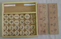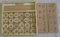 写真のように、数と記号の円板を準備しました。答えは板に書いていますから、その通りになるように並べます。苦労して作った割には、人気がなかったようです。工夫したのですが、残念です。